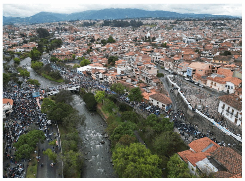 El 16 de septiembre, una histórica marcha ciudadana de más de 100.000 personas recorrió la ciudad de Cuenca, en el sur de Ecuador, al grito “!NO a la minería, sí a la vida!”, exigiendo al gobierno del ultraderechista Daniel Noboa detener la concesión minera otorgada a una transnacional canadiense para explotar oro y cobre en la zona protegida que abastece de agua a la región. “Kimsacocha no se toca” fue la voz enardecida que se escuchó en todo el país ante la sordera gubernamental que desoyó el mandato popular de la consulta del 7 de febrero de 2021, en el que se prohibió la explotación minera en zonas de recarga hídrica. Las mujeres indígenas y campesinas dijeron en su canto: “las comunidades han hablado, las lagunas han hablado, la ciudad ha hablado, el páramo ha hablado, la paja dorada que capta gotas de agua como estrellas ha hablado”. (Pressenza, 17/11/2025