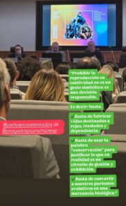 La intervención de Pedro Pozas se centró principalmente en la necesidad de poner fin a la reproducción en cautividad de los grandes simios, una práctica que —lejos de responder a criterios científicos independientes— constituye la principal vía de abastecimiento de los zoos para mantener el modelo de exhibición y negocio.