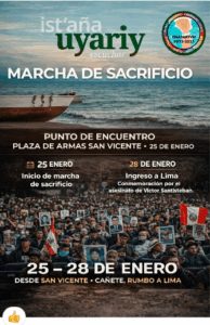 La marcha de sacrificio partirá este 25 de enero desde la ciudad San Vicente de Cañete (al sur de Lima) hacia la ciudad capital, donde ingresará el próximo miércoles 28, para realizar diversas actividades, como un Encuentro nacional donde se fusionarán las delegaciones provenientes de Puno, Ayacucho, Cusco, Apurimac, Junín, La Libertad, Ica, Arequipa, con colectivos de la Generación Z.