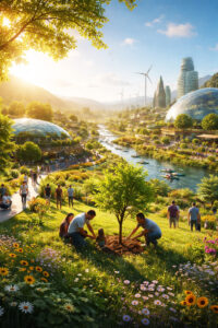 • Economía circular y energías renovables: Los recursos naturales se utilizarían de manera responsable, y las economías estarían basadas en modelos circulares, donde los desechos se minimizan y los productos se reutilizan. La energía provendría principalmente de fuentes limpias y renovables, como la solar, la eólica y la geotérmica.