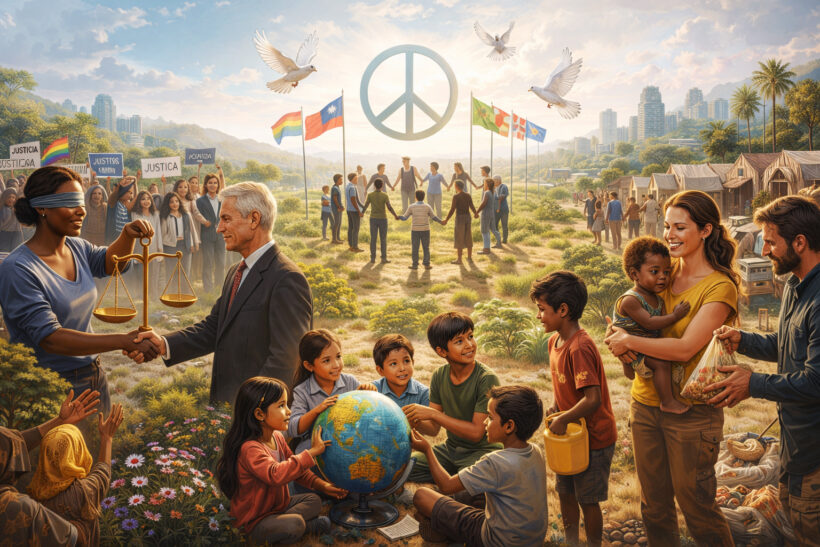 En este mundo ideal, la paz sería el estado natural de las relaciones internacionales y locales. Las guerras y los conflictos armados serían reemplazados por el diálogo, la diplomacia y la cooperación. Los recursos que actualmente se destinan a la guerra y la militarización se invertirían en el bienestar de las personas y la protección del medio ambiente.