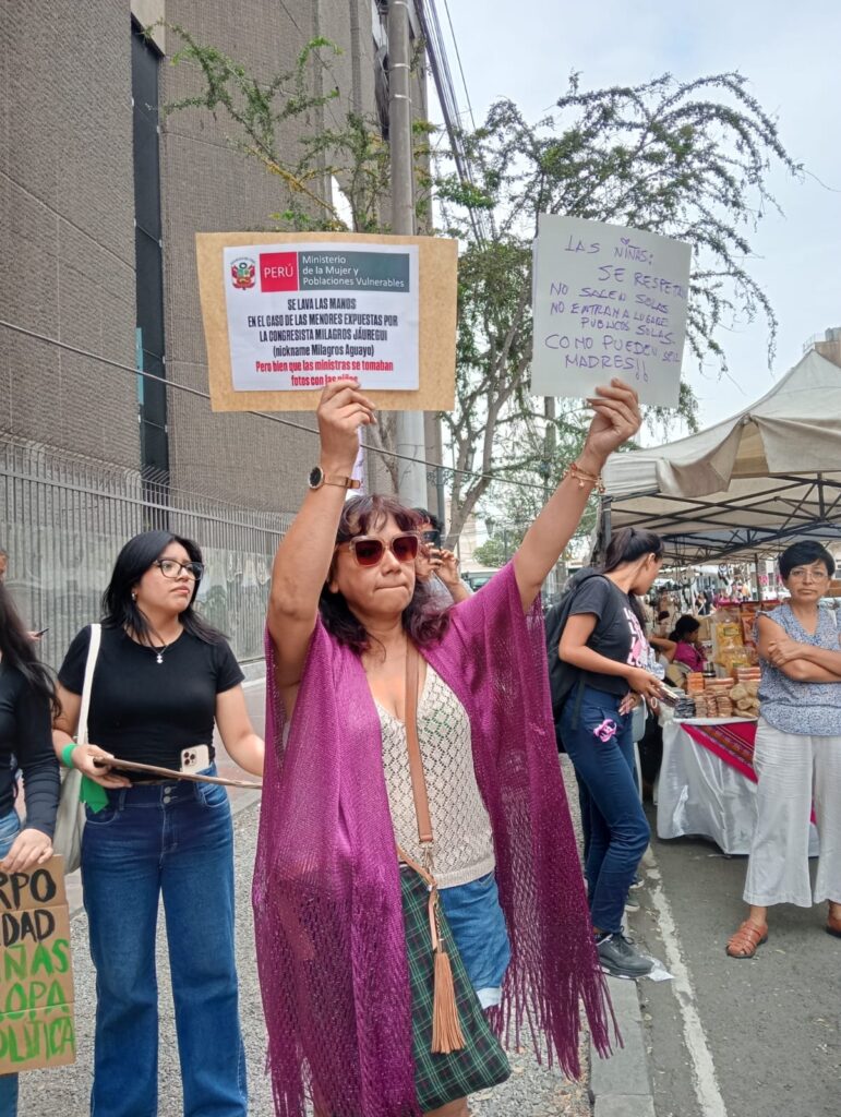 Los manifestantes, de diversas organizaciones defensoras de derechos humanos, como la Coordinadora Nacional de Derechos Humanos, Federación Nacional de Mujeres Campesinas (FENMUCARINAP), el Movimiento Manuela Ramos, grupo Yemanyá Batucada, entre otros, realizaron representaciones teatrales y musicales para sensibilizar a la población, pero sobre todo, a la ministra de la Mujer, Sandra Gutierrez Cuba invocando su intervención personal en este caso, que representa una instrumentalización política de niñas vulnerables y la utilización del dolor de las víctimas.