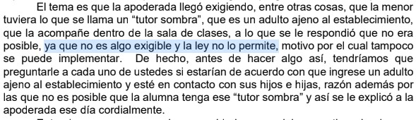 Mientras el establecimiento aseguró en un comunicado a los apoderados, en el que no fue incluida Katherine, que ella habría exigido la presencia de un “tutor sombra”. La madre de Nataxa sostiene que nunca realizó tal solicitud, evidenciando una divergencia significativa en el relato de los hechos. A esto se suma un punto clave: el liceo argumentó que esta figura “no es algo exigible y la ley no lo permite”; sin embargo, la normativa chilena no prohíbe el acompañamiento individual. Si bien no está contemplado como recurso financiado dentro del Programa de Integración Escolar, tampoco está prohibido, y puede evaluarse como un ajuste razonable en el marco del derecho a la educación inclusiva. En esa línea, la asistente social Verónica Soza Weber cuestionó esta interpretación restrictiva.