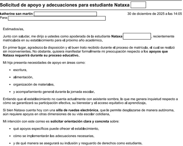 En diciembre de 2025, antes del inicio del año escolar, la madre de Nataxa se contactó con el establecimiento mediante correo electrónico para conocer de qué manera se abordarán las necesidades de su hija dentro del espacio educativo. En ese intercambio, lejos de exigir medidas específicas como “tutor sombra” (una persona que entrega apoyo a un estudiante en específico dentro del aula, sin interferir con la clase), planteó la necesidad de contar con claridad sobre los apoyos, adecuaciones y formas de acompañamiento que facilitan su participación en condiciones adecuadas que pudiera entregar el liceo. Hasta la fecha dicho correo sigue sin respuesta.