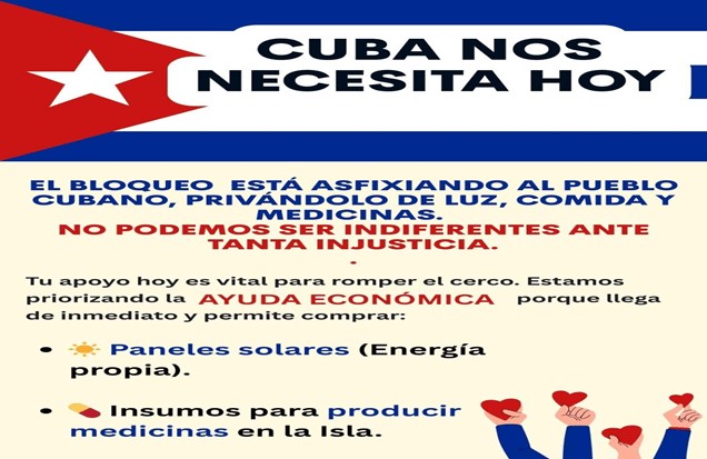 La Red Continental de apoyo a la nación caribeña designó al Movimiento de Solidaridad Amor por Cuba para recibir dinero para dotar de paneles solares con prontitud a la isla, siendo las coordinadoras de esta tarea solamente Milagro Solís Aguilar por el Simpe 83 6421 40, y Karol Vega por el Simpe 62694395.