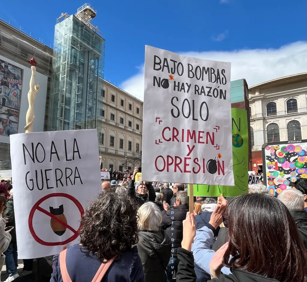 En España, país que en Europa ha encabezado el no a formar parte de la ilegal guerra contra los iraníes, miles de personas se han manifestado contra las guerras denunciando a los países invasores y retomando el lema que llenó las calles en 2003 para mostrar su inconformidad con la invasión de Irak: “¡No a la guerra!”.