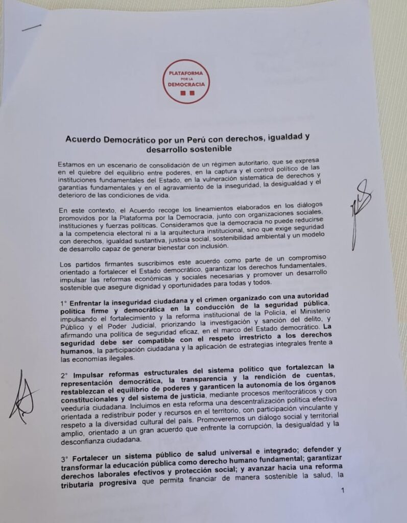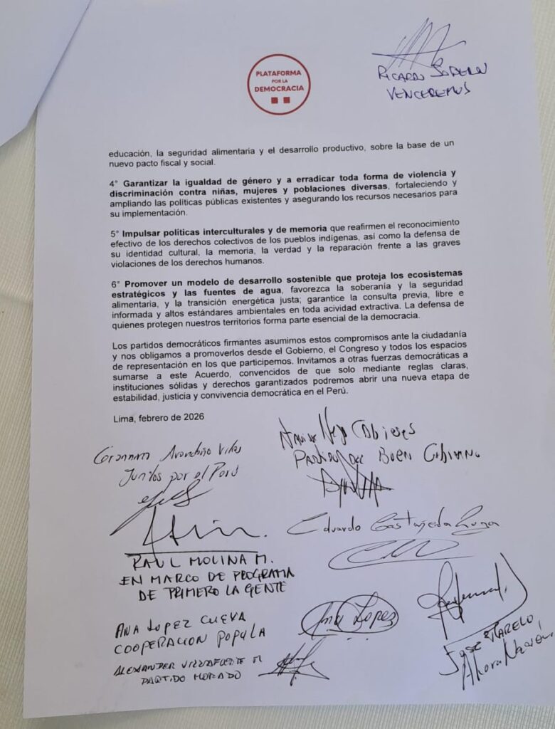 Por un Perú con justicia, derechos y desarrollo sostenible. El V Diálogo Político Social, convocado por la Plataforma por la Democracia alcanzó la firma de nueve partidos participantes, que postulan en las Elecciones Generales 2026, con el objetivo común de “articular una Agenda Política Democrática (integradora, holística y consensuada) en diálogo con los partidos democráticos, que expresen salidas (alternativas) conjuntas que nos permita enfrentar el deterioro del régimen político democrático y sus consecuencias en la vida de los pueblos y la naturaleza”.