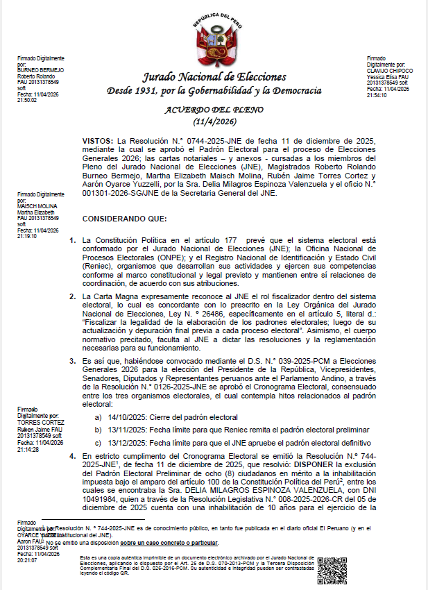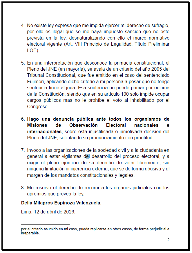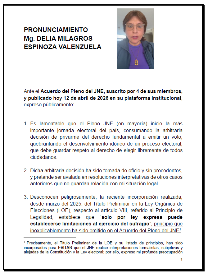 A continuación el comunicado del Jurado Nacional de Elecciones y de la doctora Delia Espinoza Valenzuela, ambos implicados en un hecho que empaña las Elecciones Generales 2026 y que exige la intervención de los veedores nacionales e internacionales, por afectar derechos fundamentales.