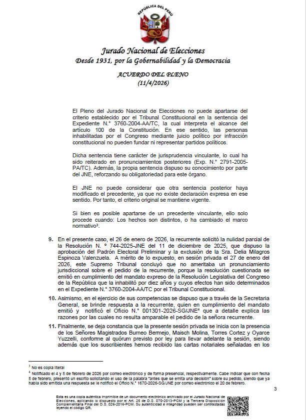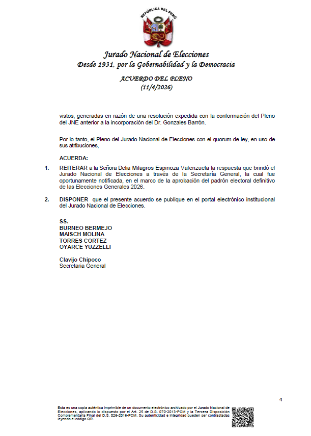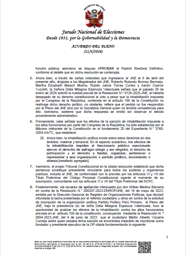 Por su parte, el JNE como máximo organismo electoral, afirmó en comunicado que «En estricto cumplimento del Cronograma Electoral se emitió la Resolución N.º 744-2025-JNE1, de fecha 11 de diciembre de 2025, que resolvió: DISPONER la exclusión del Padrón Electoral Preliminar de ocho (8) ciudadanos en mérito a la inhabilitación impuesta bajo el amparo del artículo 100 de la Constitución Política del Perú2, entre los cuales se encontraba la Sra. DELIA MILAGROS ESPINOZA VALENZUELA, con DNI 10491984, quien a través de la Resolución Legislativa N.° 008-2025-2026-CR del 05 de diciembre de 2025 cuenta con una inhabilitación de 10 años para el ejercicio de la función pública (…).
