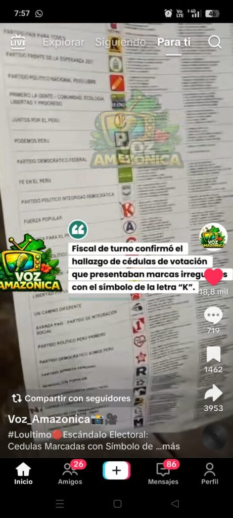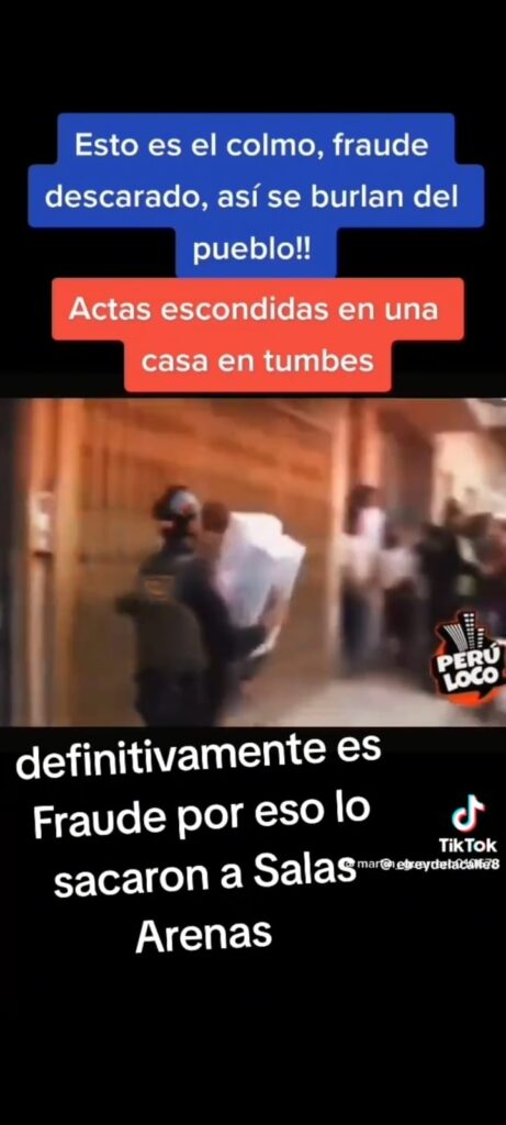 Desde tempranas horas de la mañana, la población denunciaba diversos episodios de fraudes suscitados en las diferentes regiones del país. En Tumbes, una población indignada denunció que en una casa se escondía material electoral, el mismo que luego fue trasladado por efectivos de la Policía Nacional; en otra región la población denunció con imágenes en tiktok, el hallazgo de actas y cédulas de votación llenadas con la “K” del partido Fuerza Popular (de Keiko Fujimori).