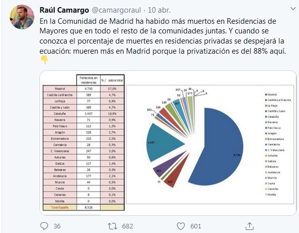 Raul Camargo, ex diputado de la Asamblea de Madrid y militante de Anticapitalistas denunció durante años la privatización y el maltrato institucional en el sector gerontológico en Madrid. Lo explicaba así en declaraciones para Europa Press “(…)es un problema de fondo, cuando este tipo de servicio se presta con el objetivo de conseguir un beneficio económico, esto se consigue pagando salarios bajos, recortando en personal, recortando en inversiones (…) este el problema general que hay en las residencias de la Comunidad de Madrid, que es la región que soporta un mayor nivel de privatización en este sector (…)solo un 5 por ciento de las residencias son públicas en esta región”