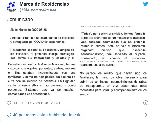 Ya a mediados de marzo, sindicatos como el MATS (Movimiento Asambleario de Trabajadores/as de Sanidad) dieron la voz de alarma sobre la falta de material sanitario en las residencias privadas de mayores y la imposibilidad de llevar a cabo los protocolos establecidos por falta de personal y recursos materiales.