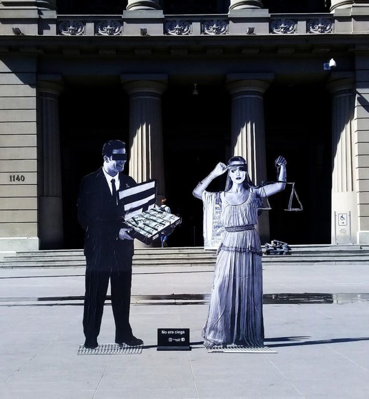 El stencil de Jaime Guzmán tuvo algunas consecuencias políticas: hay algunas notas de prensa al respecto. A propósito de eso, llevé hace poco un par de personajes impresos al exterior de los tribunales de justicia (Nota de Pressenza: este trabajo se puede ver en la foto de portada).