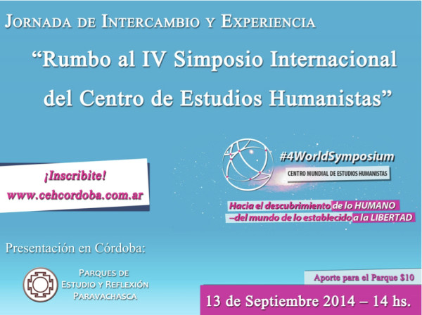 El sábado 13 de Septiembre se realizará en el Parque de Estudios y Reflexión Paravachasca una jornada de diálogo y experiencia bajo el título “Rumbo al IV Simposio del Centro Mundial de Estudios Humanistas: Hacia el descubrimiento de lo Humano – del mundo de lo establecido a la Libertad”.