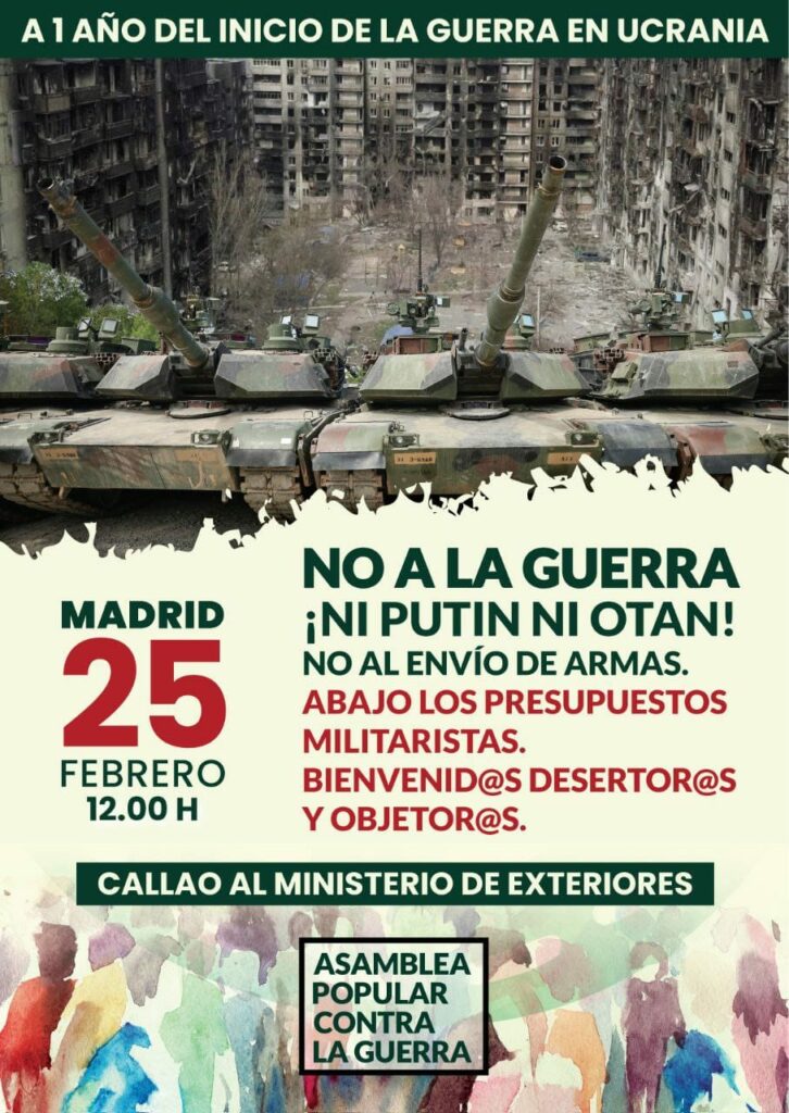 En los días 24 y 25 de febrero, tendrán lugar manifestaciones en todo el Estado español con motivo del primer aniversario de la invasión de Ucrania por parte de Rusia. En las convocatorias, se pide no seguir enviando armas que únicamente beneficia a quienes las venden, y que se abra un proceso de negociación.