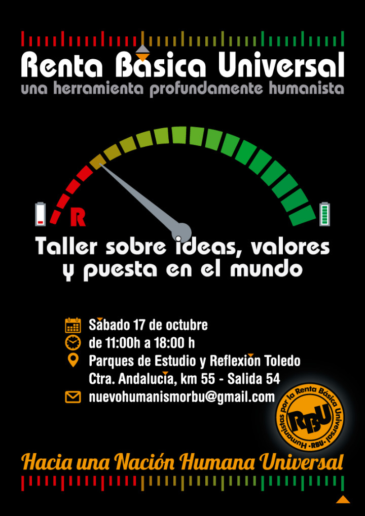 El sábado 17 de octubre, está convocado en Parque Toledo el taller Renta Básica Universal: una herramienta profundamente humanista. Será de 11 de la mañana a 6 de la tarde y está convocado por Humanistas por la Renta Básica Universal, un colectivo que acaba de nacer y que se declara abierto a la inclusión de nuevos miembros de cualquier parte del planeta.