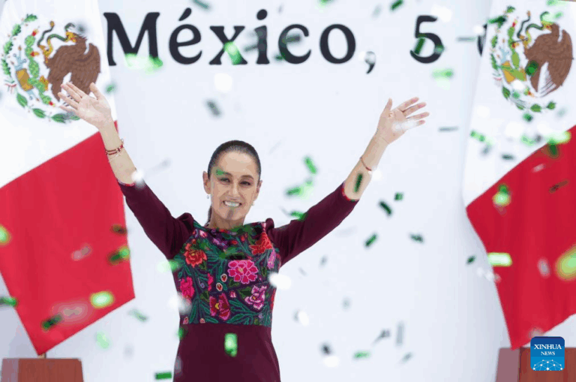 La presidenta mexicana, Claudia Sheinbaum, sonríe durante el evento «La transformación avanza», en la Ciudad de México, capital de México, el 5 de octubre de 2025. Sheinbaum celebró el domingo su primer año de Gobierno iniciado el 1 de octubre de 2024 con un mensaje público en la plaza central de la capital del país, en el que reafirmó su compromiso de defender al país y rechazó cualquier injerencia extranjera o violación del territorio mexicano. (Xinhua/Francisco Cañedo)
