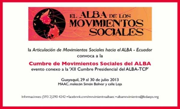 Nosotros, Movimientos Sociales de América Latina y El Caribe, reunidos en Guayaquil, Ecuador,el 29 y 30 de julio de 2013, para celebrar la Cumbre de Movimientos Sociales de la ALBA, con el desafío de profundizar nuestras propuestas de participación protagónica, en la construcción de esta gran alianza de los pueblos y de fortalecer el Poder Popular en nuestros países y en la región, rendimos homenaje al legado de Hugo Chávez, y expresamos: