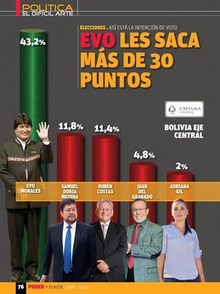 El presidente Evo Morales triplicaba y más la intención de voto de sus escoltas en los sondeos a 7 meses  de las elecciones bolivianas, el empresario Samuel Doria Medina y el gobernador del departamento de Santa Cruz, Rubén Costas, según…