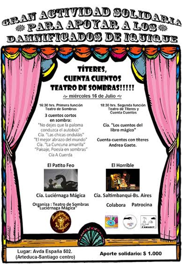​Los colectivos Saltimbanqui de Buenos Aires y Luciérnaga Mágica de Huechuraba, invitan a compartir una velada solidaria junto a al Teatro de Sombras y de Títeres, para revivir el espíritu solidario con quienes aún no reciben ayuda después del terremoto…