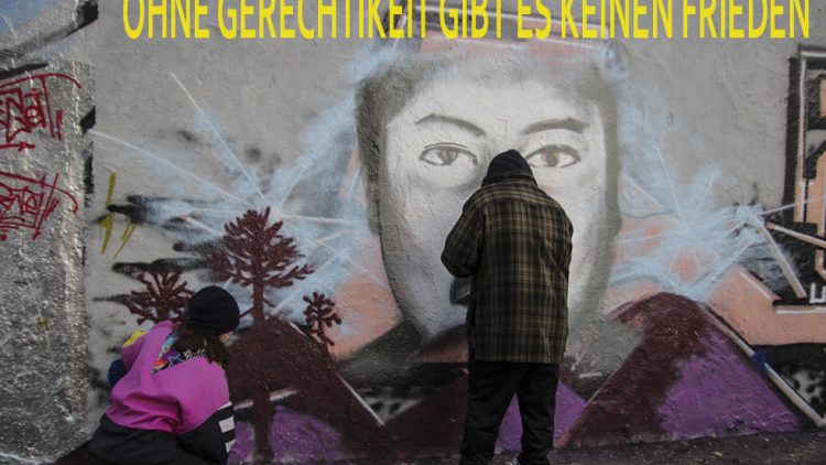 …bajo este lema chilenas y chilenos que apoyan su lucha se reunieron nuevamente en el Parque Mauerpark de Berlín para escribir sus consignas en los restos del Muro de Berlín que cayó en 1989. La acción estuvo dedicada a Camilo…