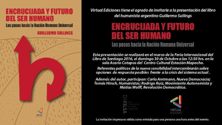 El Partido Humanista, tiene el agrado de invitar al lanzamiento del libro “Encrucijada y Futuro del Ser Humano”, del escritor argentino Guillermo Sullings. En la oportunidad, referentes políticos de la nueva “sensibilidad”, intercambiarán opiniones y analizarán la actualidad y crisis…