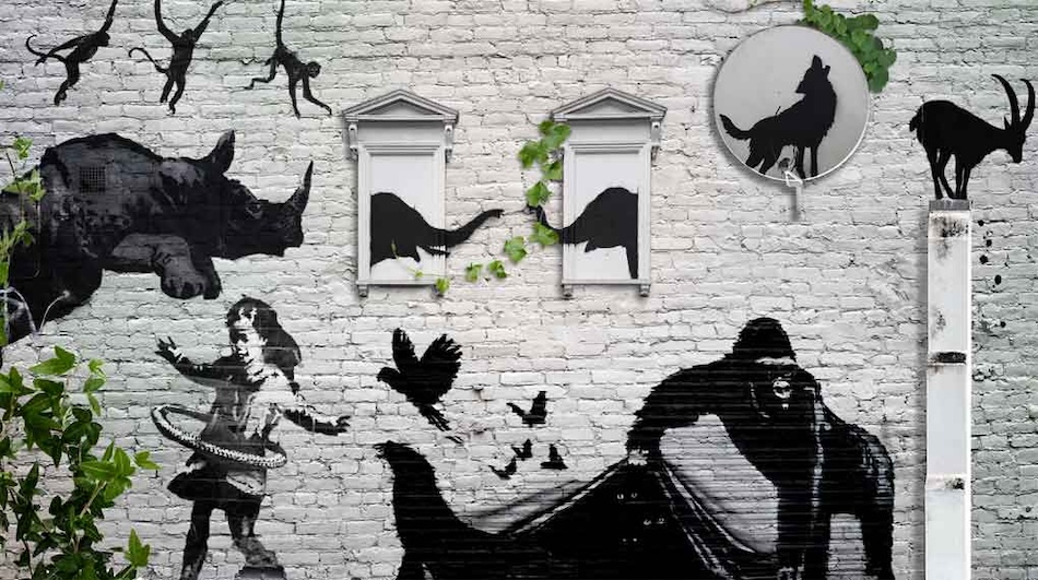 Simios, elefantes, una cabra montés, un rinoceronte, pelícanos y pirañas son los animales, entre otros, que representan al zoológico de Banksy, un artista del grafitti cuya identidad real se desconoce ante la prensa, la policía y sus seguidores. En poco…