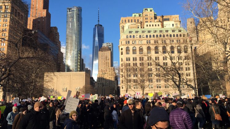 Manifestantes se reúnen en Battery Park contra la prohibición de ingreso a EUA ordenada por el Presidente Trump