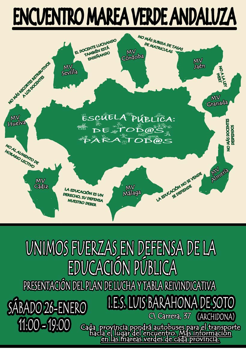 El próximo día 26 de Enero en Archidona el primer ENCUENTRO-ASAMBLEA DE MAREA VERDE ANDALUCÍA OBJETIVO: Preparación del Plan de Lucha y de la Tabla Reivindicativa de Marea Verde Andalucía Ese mismo día 26 de enero se presentará Tabla reivindicativa…