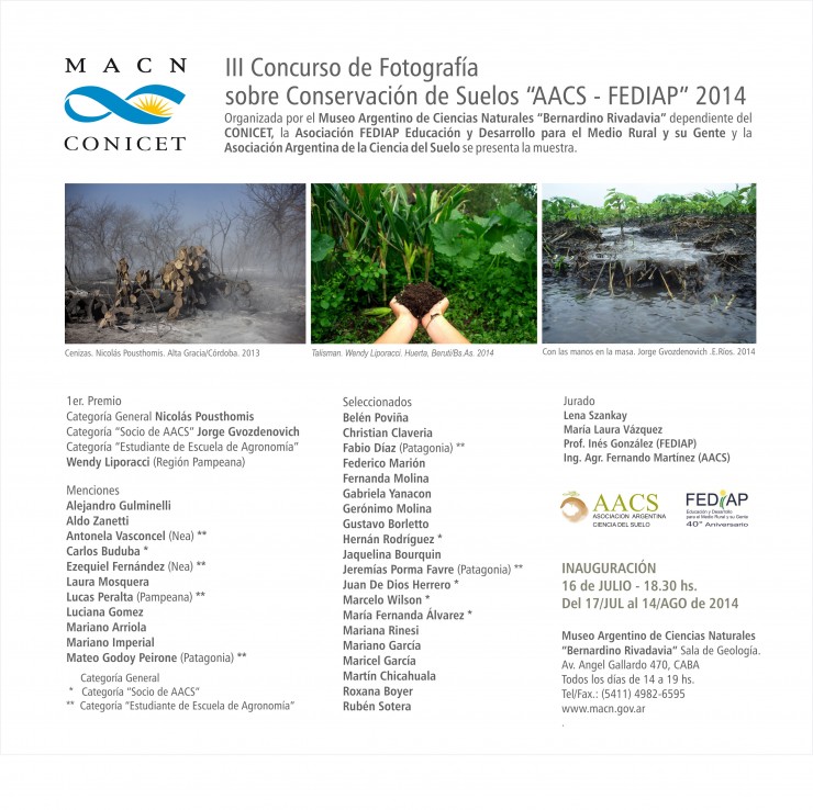 A partir de mañana se inaugura la exposición del III Concurso de Fotografía sobre Conservación de Suelos “AACS – FEDIAP” 2014, organizada por el Museo Argentino de Ciencias Naturales “Bernardino Rivadavia” dependiente del CONICET, la Asociación FEDIAP Educación y Desarrollo para…