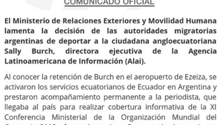 Cancillería ecuatoriana rechaza deportación de periodista de la Argentina
