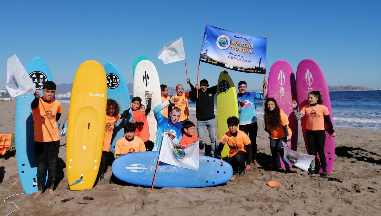 Entre tablas de surf y olas, adhirieren a la Tercera Marcha Mundial por la paz y la noviolencia en La Serena