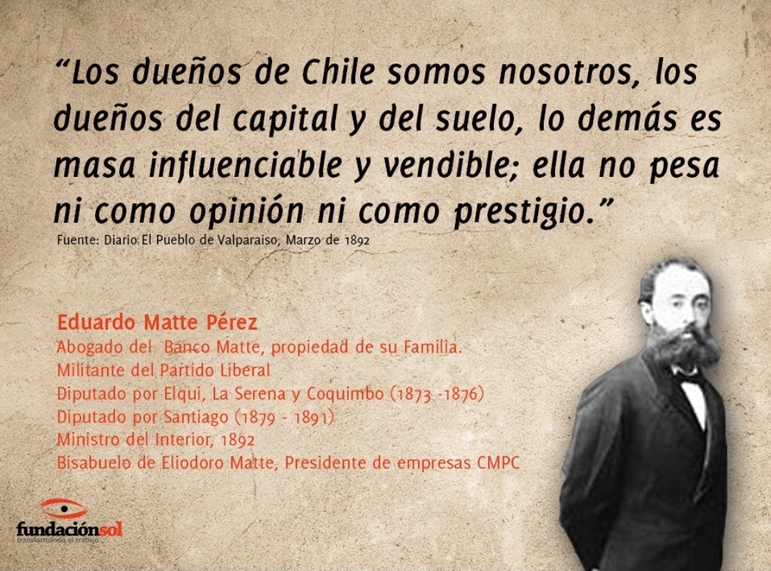 “Los dueños de Chile somos nosotros, los dueños del capital y del suelo; lo demás es masa influenciable y vendible; ella no pesa ni como opinión ni como prestigio”. Eduardo Matte Pérez, 1892. El siglo XIX parecía lejano, pero la…