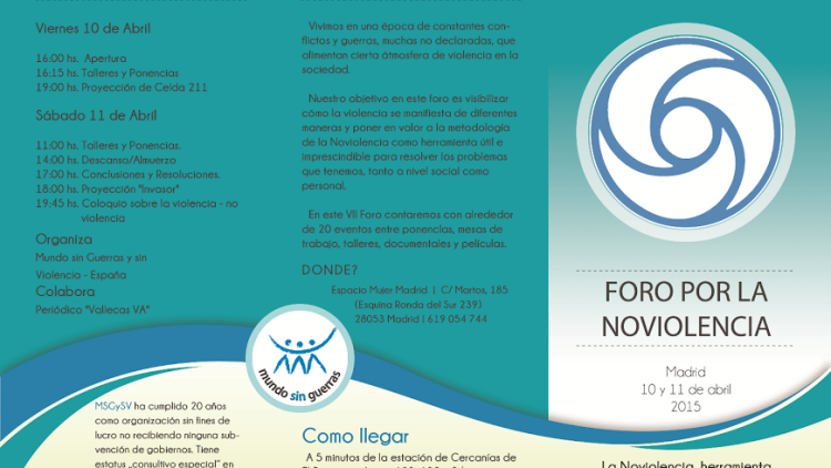 La organización Mundo sin Guerras y sin Violencia, junto a otras asociaciones y entidades colaboradoras con las que compartimos el objetivo de crear conciencia noviolenta, ponemos en marcha la IV edición del Festival Internacional de Cine de la No Violencia…
