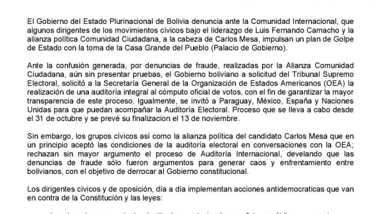 En un comunicado dado a conocer este viernes (8) el gobierno del Estado Plurinacional de Bolivia denunció ante la comunidad internacional un intento de golpe de Estado, impulsado por un grupo de cívicos encabezados por Luis Fernando Camacho en conjunto…