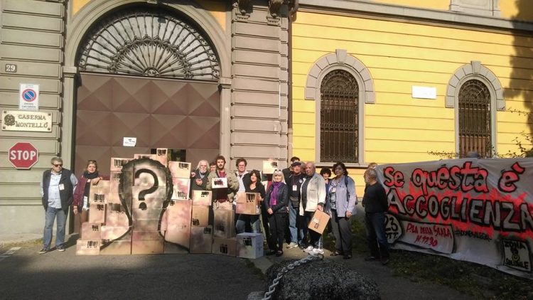 Flash mob delante del antiguo cuartel de Montello: ¡Los migrantes no son paquetes postales!
