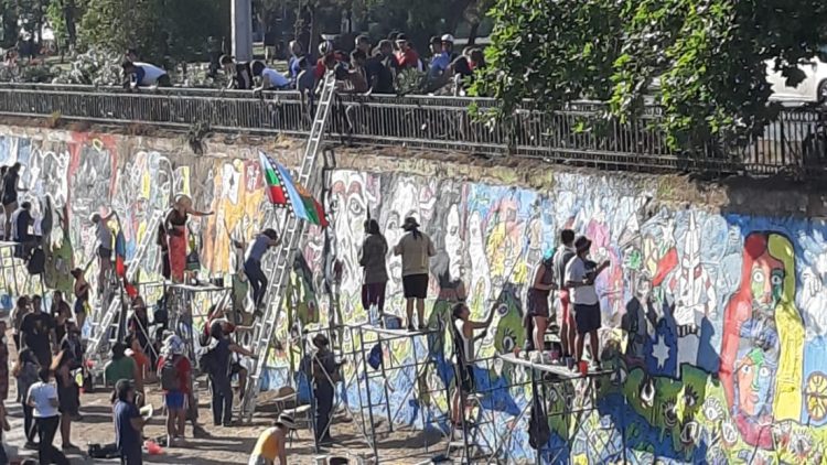 La protesta desembocó hoy en el Río Mapocho, donde muchísimos grafitteros jóvenes trabajaron al amparo de la experiencia del Mono González para dar forma a un extraordinario mural, dando cuenta del espíritu que ha impregnado la lucha de un pueblo…