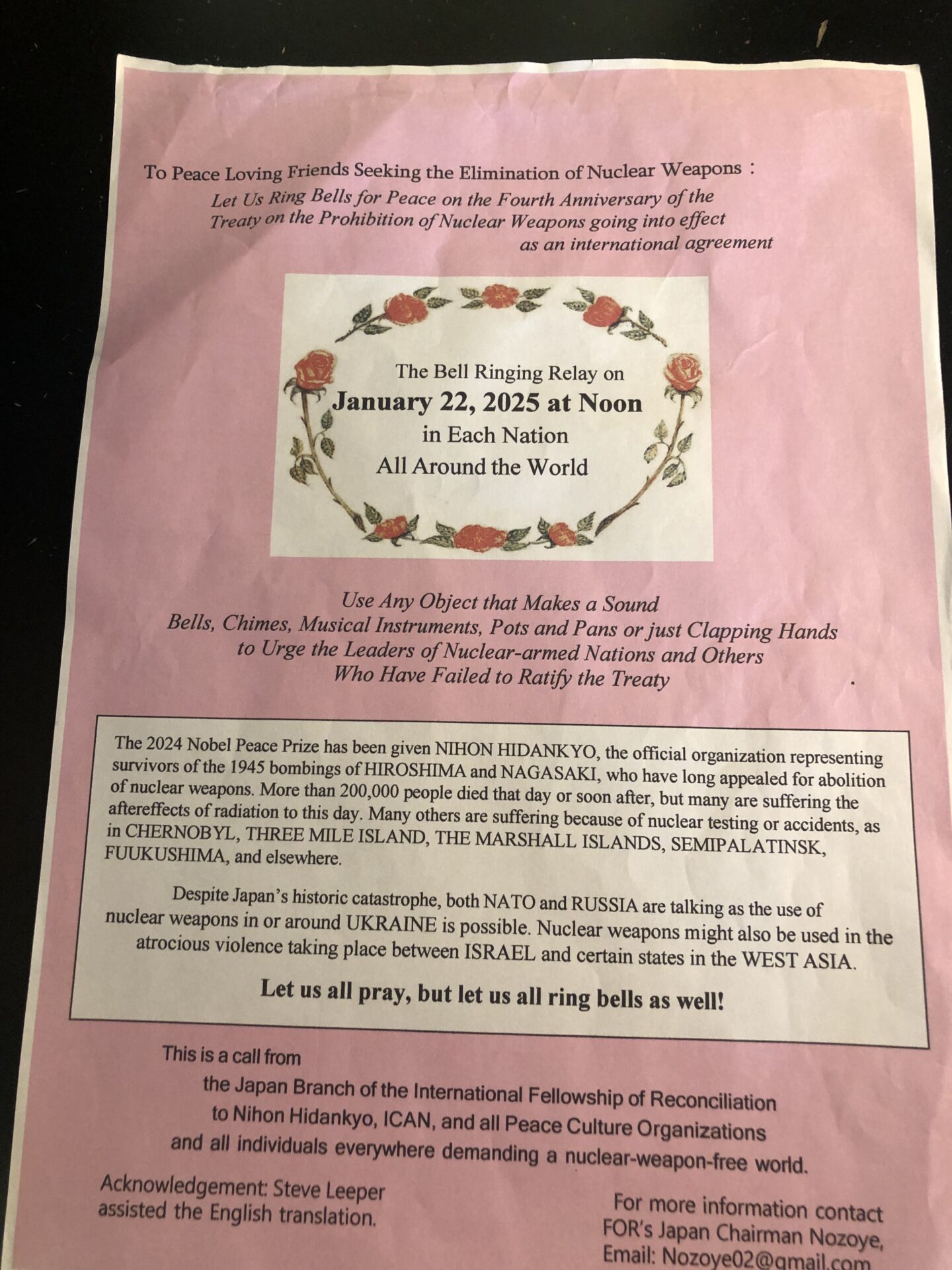 A todos quienes aspiran a la Paz y a la eliminación de las armas nucleares, se les invita a replicar campanas por la paz en el cuarto aniversario de la firma del Tratado de Prohibición de Armas Nucleares, entrado en…