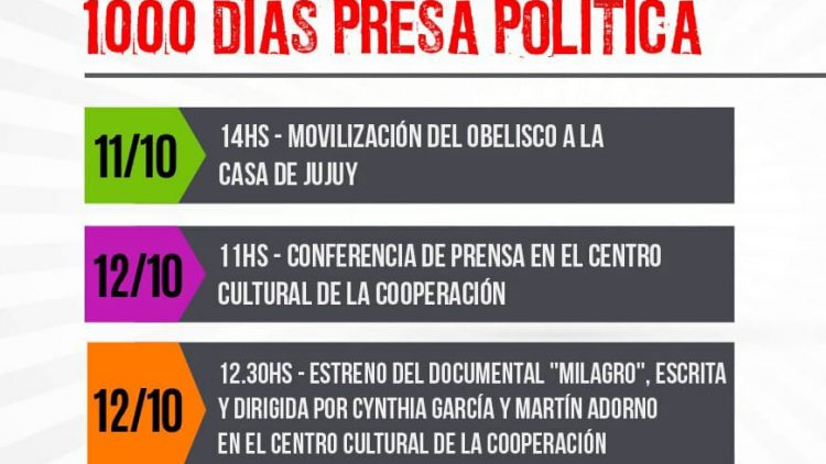 Este viernes 12 de octubre se cumplirán 1.000 días de la arbitraria e ilegal detención de la Diputada del Parlasur Milagro Sala. Realizaremos en Buenos Aires una movilización el día jueves 11 desde el Obelisco hacia la casa Jujuy y…