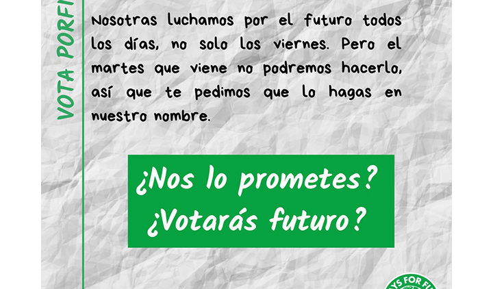 Este viernes 30, a las 12.30 hs, Fridays For future Madrid lanzó el hashtag #PrometoVotarFuturo “para pedir a los adultos de Madrid que prometan votar por nuestro futuro.” No vamos a hablar por ellos, porque ellos hablan muy bien por…