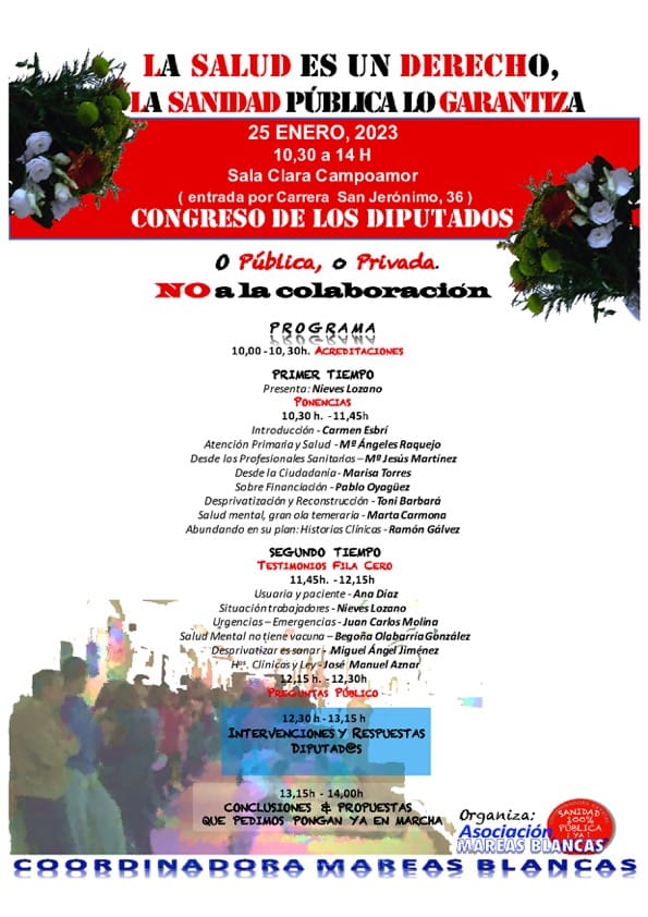O Pública o Privada NO a la colaboración  La Asociación MAREAS BLANCAS ha organizado un acto en el Congreso de los Diputados según cartel adjunto. Las Mareas Blancas han querido llevar al congreso la grave situación por la que está…