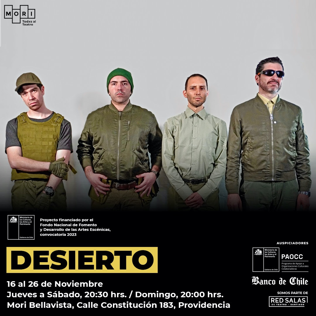 “Desierto” estará en cartelera hasta el 26 de noviembre en el Teatro Mori Bellavista Desierto cuenta la historia de cuatro funcionarios de Carabineros de Chile, los que arriba de una patrulla policial recorren las calles de Alto Hospicio en la región…