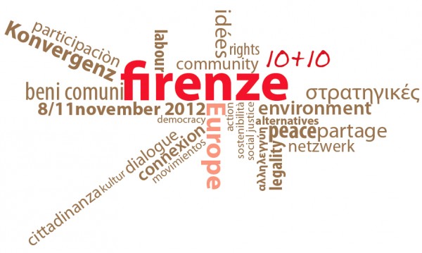 construction “in itinere” de Florence 10+10. En même temps, on vous invite à participer au séminaire européen qui a été programmé dans le cadre du procès du Forum social mondial, du 14 au 16 septembre, à Milan. Il sera principalement dédié à la préparation et à l’organisation de la rencontre à Florence. Dans claque pays, beaucoup de rencontres pourront contribuer au procès préparatoire, par plusieurs réseaux, y compris l’événement préparatoire FSM 2013 à Monastir en Tunisie en juillet et, avec espoir, une rencontre en Grèce, à haute valeur symbolique et politique.