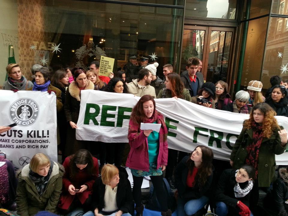 L’action du Réseau Action Directe contre ces ajustements visait à transformer les Starbucks en refuges, garderies et hébergements pour les nécessiteux en protestation contre l’impact des coupes du gouvernement faites sur le dos des femmes.