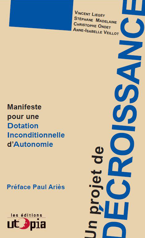 Ces réflexions ont débouché sur une proposition appelée Dotation Inconditionnelle d’Autonomie (DIA), couplée à un Revenu Maximum Acceptable. Ce manifeste pour une DIA part des origines de la Décroissance et propose des pistes, des réflexions susceptibles d’initier une transition sereine et démocratique vers des sociétés écologiquement soutenables et socialement justes. Il représente en cela un projet de Décroissance.