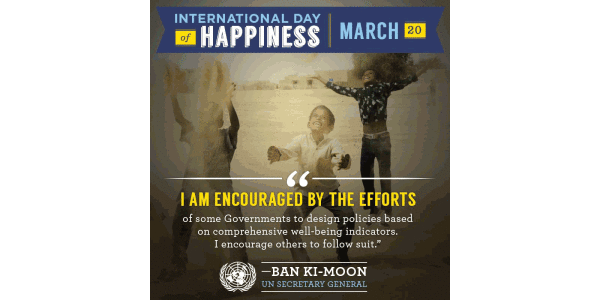 « Cette première Journée internationale du bonheur nous offre l’occasion de renforcer notre détermination à promouvoir un développement humain durable et sans exclusive et à renouveler notre promesse d’aider les autres. Lorsque nous contribuons au bien commun, nous nous enrichissons nous-mêmes. La compassion apporte le bonheur, et elle nous aidera à façonner l’avenir que nous voulons », a-t-il ajouté.