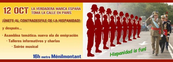 Ce 12 octobre 2013 pour fêter le jour de l’hispanité, des jeunes émigrés espagnols participeront à la Marea Granate de Paris, avec le slogan la véritable « marque espagnole » sort dans les rues . Au programme un contre-défilé pour revendiquer qu’ils ne sont pas partis volontairement de leur pays mais bien contraints par les politiques d’austérité qui saccagent leur avenir.