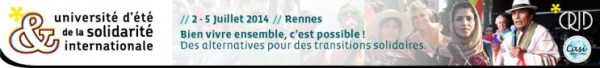 L’Université d’Été de la Solidarité Internationale 2014 se propose de mettre en avant ces alternatives, et de porter le thème des transitions (sociales, économiques, démocratiques, géopolitiques, écologiques…) pour s’inscrire dans une dynamique optimiste et communicative. Faisant écho à des processus en cours, ces 4 jours de rencontres et de dialogues auront pour but d’échanger et de former les citoyen-ne-s que nous sommes aux moyens à mettre en œuvre pour la construction de transitions solidaires. Rendez-vous donc à Rennes en juillet 2014 !