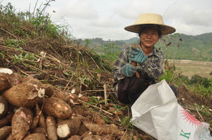 [/media-credit]Culture du manioc sur les rives du Mékong : les petites fermes ont tendance à donner à la production alimentaire priorité sur la production de matières agricoles et de cultures d’exportation.