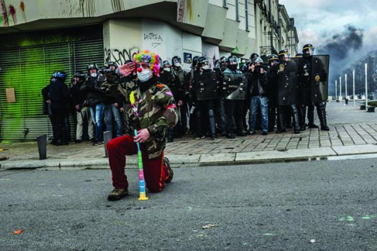 Dans les manifestations, les clowns ont aussi la capacité de gêner les forces de l’ordre. Mimées, ridiculisées, mais non agressées, celles-ci ne savent pas comment réagir. Lors de la manifestation contre l’aéroport de Notre-Dame-des-Landes, en février 2014 à Nantes, les clowns ont fait tampon pendant plus d’une heure entre policiers et manifestants, permettant d’une part à de nombreuses personnes de se calmer, de prendre un peu de distance, de rire à un moment où régnait plutôt la tension, et d’autre part de gêner la police qui ne peut plus tirer à travers les clowns dansant devant eux… Et puis, « au milieu d’une zone de guerre, c’est beau, c’est plein de couleurs, d’amour, de fleurs… ». Finalement, la police a fait usage de gaz lacrymogènes pour venir à bout de la quarantaine d’activistes grimaçant devant eux, jetant des fleurs et gesticulant. Une intervention qui « met en lumière où se situe incontestablement la véritable violence ».